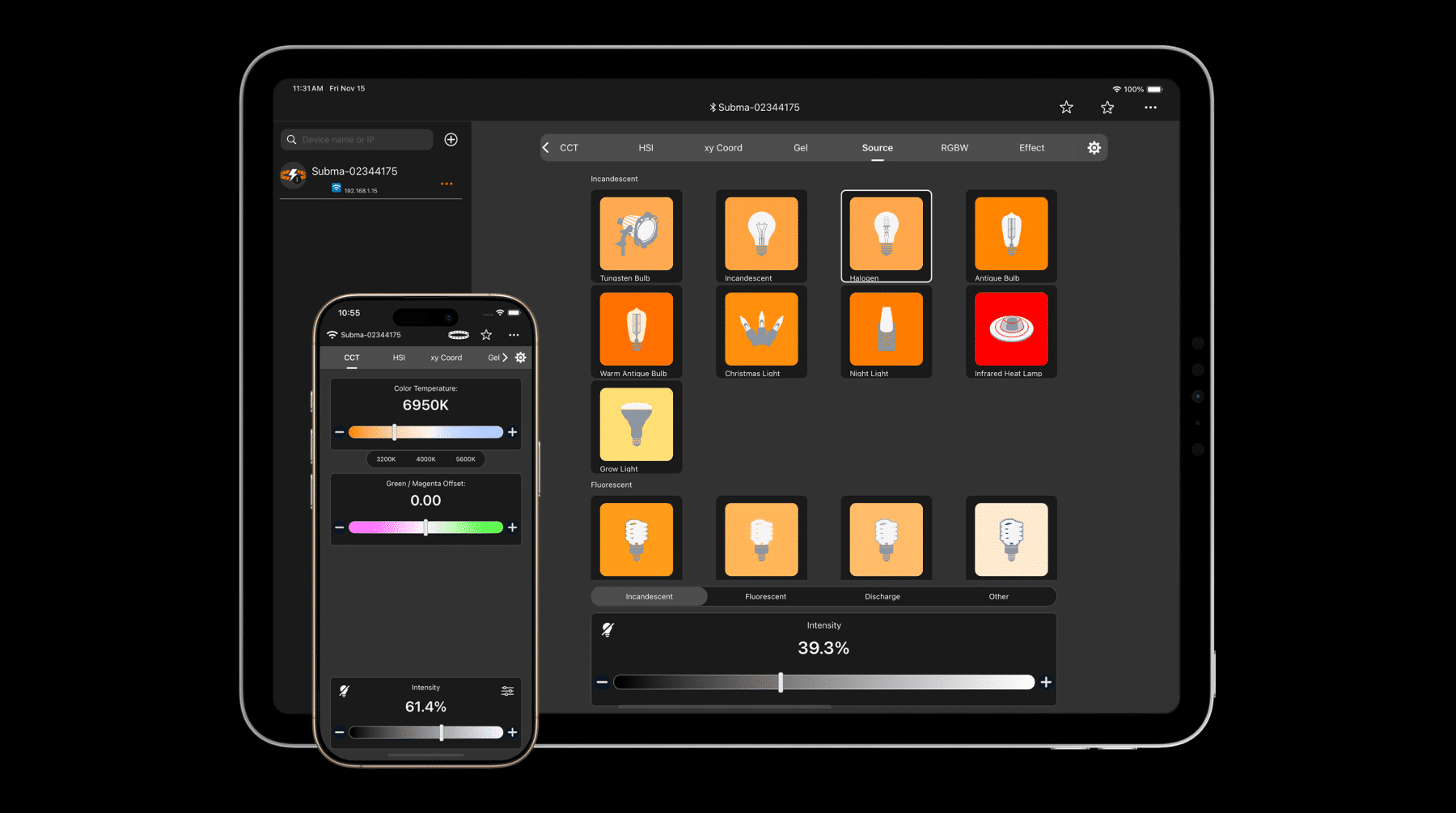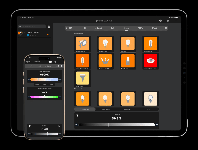 • Match daylight / tungsten fixtures or anything in between via the Correlated Colour Temperature controls