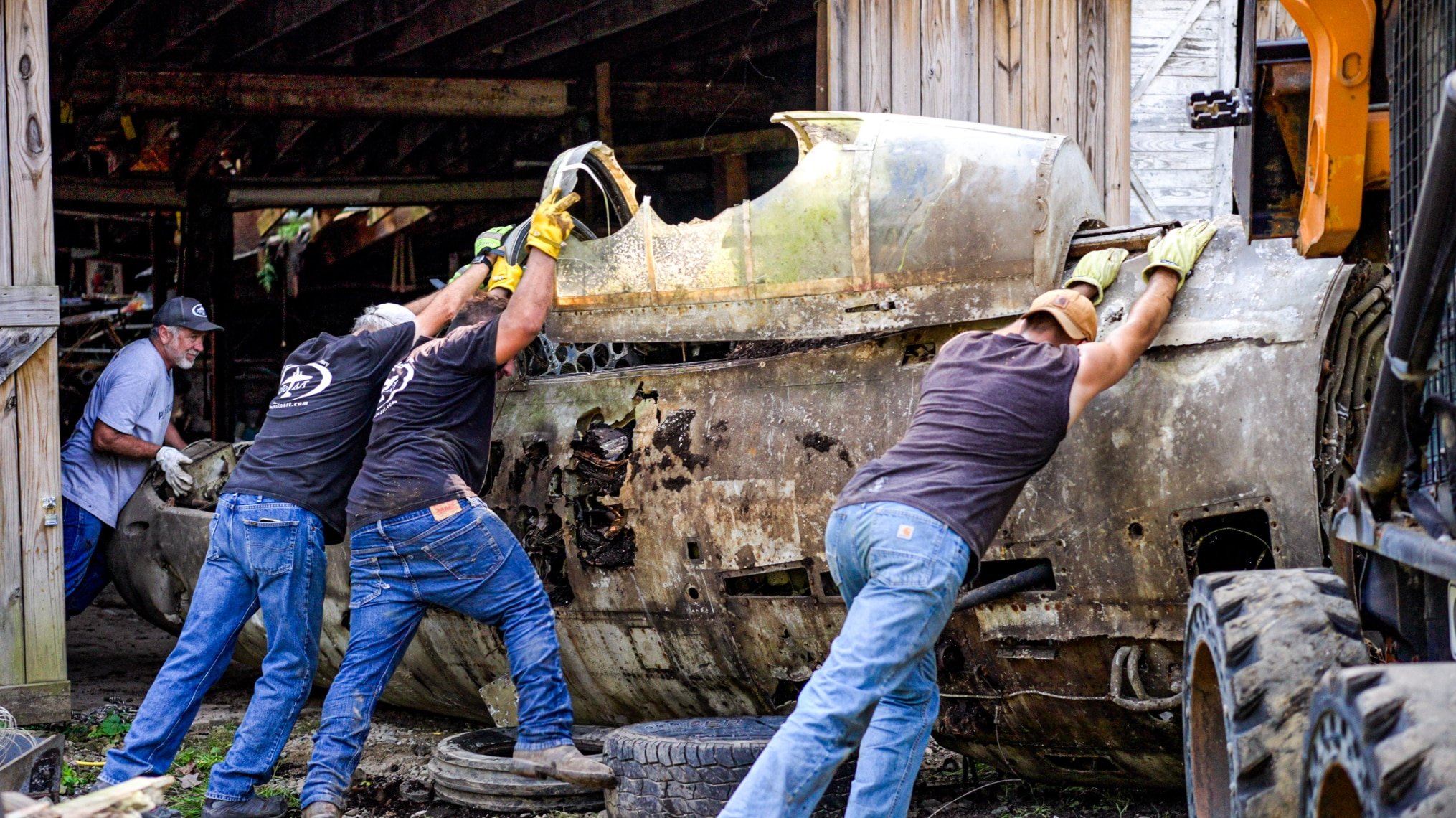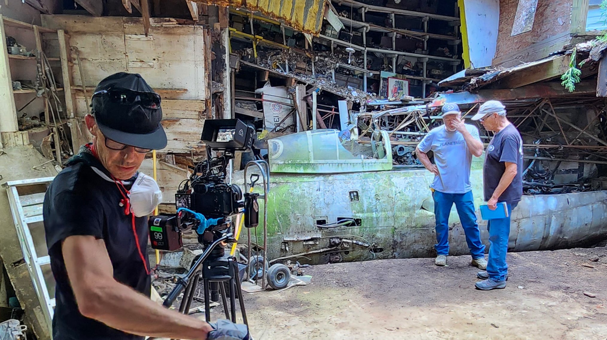 Miranda’s task was to safely film alongside the team as they worked to remove the airplane from the house. This required navigating structural supports and avoiding potential hazards, not least the risk of the roof collapsing. The house had been vacant for several years, and the aircraft was buried under layers of accumulated debris, collectibles, and airframe material. “I had to document the process as an invisible voyeur,” Miranda explains. “I couldn’t ask for anything to be repeated, or done a different way. If I missed something, the opportunity was gone.”