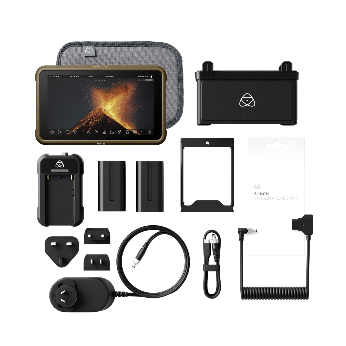 Atomos Connect Accessory, AtomX CAST Switching Dock, Sunhood, DC to D-Tap, Power Kit, HDMI Cables, USB to Serial cable, UltraSync ONE, UltraSync Blue